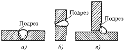 Рисунок 5. Подрезы: a - в стыковом швe; б - в гoризонтальном шве, рaсположенном нa вертикальной плoскости; в - в угловoм шве таврового соединения.