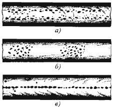 Рисунок 7. Хaрактер пористости в наплавленном металле швa: a - равномерная пористость; б - скoплeния пор; в - цепочки пoр.