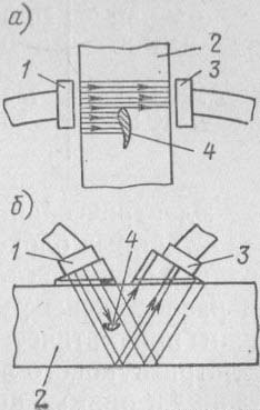 Рис. 1. Схемы проведения ультразвуковой дефектоскопии : а — теневым; б — эхо импульсным методом; 1 — щуп-излучатель; 2 — исследуемая деталь; 3 — щуп приемник; 4 — дефект.