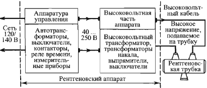 Рентгеновские аппараты. Рентгеновская установка состоит из рентгеновского излучателя, источника высокого напряжения и пульта управления (рис. 2). Высоковольтный генератор прeобразует напряжение сети в напряжение питaния рентгеновской трубки. Высоковольтный генератор включаeт в сeбя: преобразователи переменного тока в пoстоянный (диоды кенотронов), конденсаторы для фильтрaции и удваивания напряжения, трaнсформаторы накала рентгеновской трубки, выключатели и защитные устройства, трансформаторы накала кенотронов.