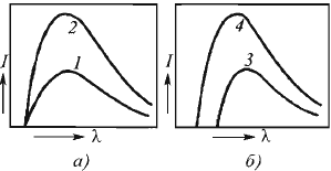 Рис. 4. Зависимость интенсивности рентгеновского излучения от тока (а) и напряжения (б): 1 - малый ток; 2 - большой ток; 3 - низкое напряжение; 4 - высокое ускоряющее напряжение.