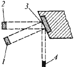 Рис. 5. Схема формирования оптического фокуса рентгеновской трубки: 1 - действительное фокусное пятно; 2 - сечение электронного пучка; 3 - анод; 4 - оптический фокус.