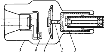 Рис. 9. Рентгеновская трубка с вращающимся анодом: 1 - анод; 2 - стержень анода; 3 - ротор; 4 - катод; 5 - баллон.