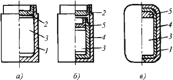 Рис. 11. Конструкции радиоактивных дефектоскопических источников отечественного производства: а, б - заваренных; в - завальцованного; 1 - наружная ампула; 2, 5 - крышки; 3 - активная часть; 4 - внутренняя ампула.