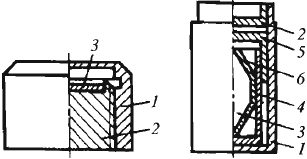 Рис. 12. Конструкции радиоактивных дефектоскопических источников ионизирующего излучения на резьбе и сварного: 1 - наружная ампула; 2, 5 - крышки; 3 - активная часть; 4 - внутренняя ампула; б-баллон.