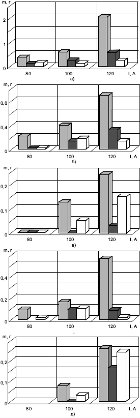 Рис. 2. Зависимость величины набрызгивания от сварочного тока при ручной дуговой сварке электродами УОНИ-13/45 (а), ОК 53.70 (б), ЛВ-52 (в), МР-3 (г) и МР-3 ("ЭСАБ") (д) (светлые столбцы — без покрытия, темные — покрытие № 1, белые — покрытие № 2)