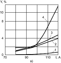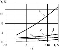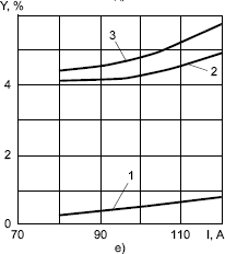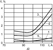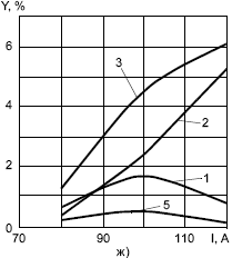 Рис. 1. Зависимость разбрызгивания и угара электродного металла от сварочного тока при ручной дуговой сварке покрытыми электродами диаметром 3 мм: а — УОНИ-13/45 (основное покрытие); б — МР-3 (рутиловое); в — УОНИ-13/55 ("ЭСАБ") (основное); г — МР-3 ("ЭСАБ") (рутиловое); д — ОК 53.70 ("ЭСАБ") (рутиловое); е — ЛВ-52 (основное); ж — ОЗС-4 (ильменитовое); 1, 2 — разбрызгивание каплями размером меньше 1,6 мм и больше 1,6 мм; 3 — общие потери на разбрызгивание; 4 — потери на угар и разбрызгивание; 5 — разбрызгивание каплями размером меньше 1 мм
