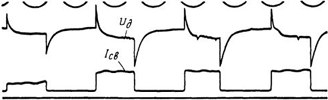 Характерной особенностью пульсирующей дуги являются броски напряжения при скачкообразных повышениях и снижениях тока, достигающие 4—5 в (рис. 5). Они имеют крутой передний и экспоненциальный задний фронты. Броски затухают в течение (1 ÷ 1,5) * 10-3 сек, что на 2—3 порядка превышает время протекания переходных процессов в мощной дуге с плавящимися электродами. По-видимому, на величину напряжения малоамперной дуги с неплавящимся электродом влияет степень разогрева активного пятна на катоде, которая ввиду большой теплоемкости вольфрама сравнительно медленно меняется со временем. В мощной же дуге с плавящимся электродом зоны, примыкающие к активному пятну, из-за его блуждания уже нагреты достаточно интенсивно и при увеличении тока их дополнительный разогрев протекает, видимо, более быстро.